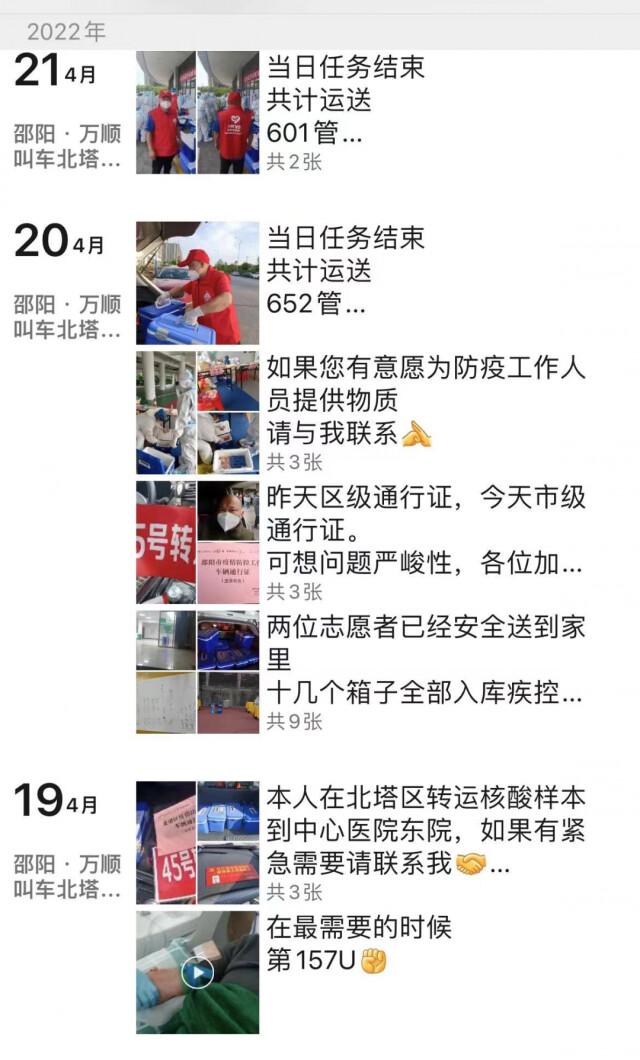 在疫情防控期間,王勇志愿負(fù)責(zé)核酸樣本轉(zhuǎn)運(yùn)工作。每天自費(fèi)行程200余公里,日轉(zhuǎn)運(yùn)樣本一萬份人次,早上五六點(diǎn)從家里出發(fā),最晚忙到晚上十一點(diǎn)多,平均日常工作達(dá)16小時。王勇在轉(zhuǎn)運(yùn)樣本空隙經(jīng)常為沿途的公安交警、志愿者、清潔工等工作人員發(fā)放約二百公斤水果、礦泉水?dāng)?shù)件。