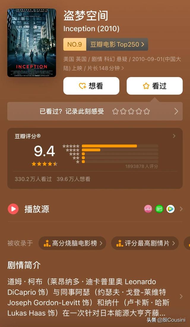 而這部電影更是在豆瓣高達(dá)9.4分的評(píng)分,評(píng)分比他高的電影可謂是屈指可數(shù),盡管很多人說豆瓣評(píng)分不準(zhǔn)確,但是也不難看出《盜夢(mèng)空間》這部電影究竟有多出色!