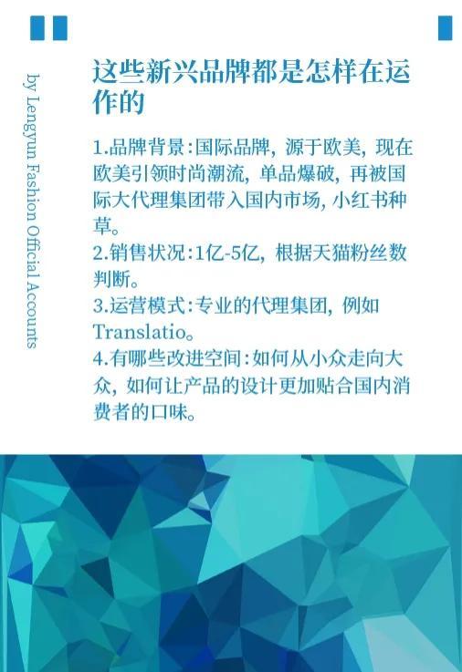 1.品牌背景:國際品牌,源于歐美,現(xiàn)在歐美引領(lǐng)時(shí)尚潮流,單品爆破,再被國際大代理集團(tuán)帶入國內(nèi)市場;小紅書種草。