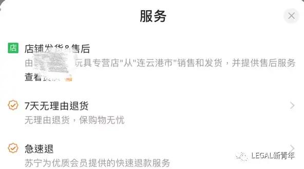 以上為蘇寧易購上的商家。在蘇寧易購的app界面,點(diǎn)擊商家網(wǎng)店頁面的“服務(wù)”一欄便會(huì)顯示上述的內(nèi)容,由于該商家明確表達(dá)了“店鋪發(fā)貨&售后”都由“XX玩具經(jīng)營(yíng)店從連云港銷售發(fā)貨以及提供售后服務(wù)”,因此亦可以視為商家的承諾。