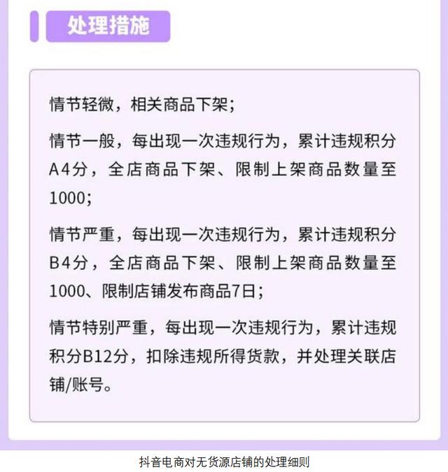 還有前面提到的抖音屏蔽#無貨源 話題標簽,與之對應,幾個月前抖音專門針對無貨源小店發(fā)布新規(guī):當識別到商家店鋪涉嫌無貨源經(jīng)營時,抖音有權利對商品或店鋪進行限制,并根據(jù)違規(guī)程度對商家進行分級處理。