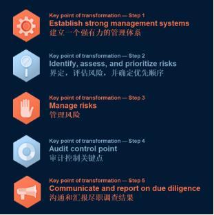 經(jīng)濟(jì)合作與發(fā)展組織(OECD)建議了一個五步走的管理模型。建議企業(yè)建立一個強(qiáng)有力的管理體系來支持企業(yè)的盡職調(diào)查管理,以保障企業(yè)自身以及其供應(yīng)鏈的合規(guī)。