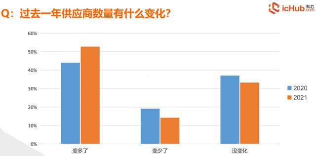 調(diào)查結(jié)果顯示,超半數(shù)以上的制造商在2021年增加了供應(yīng)商的數(shù)量,占總體52%以上,比2020年有所增長(zhǎng);在今年供應(yīng)商數(shù)量幾乎沒有發(fā)生變化的制造商有所減少,約33%,這一數(shù)值較前兩年的差距相對(duì)小。