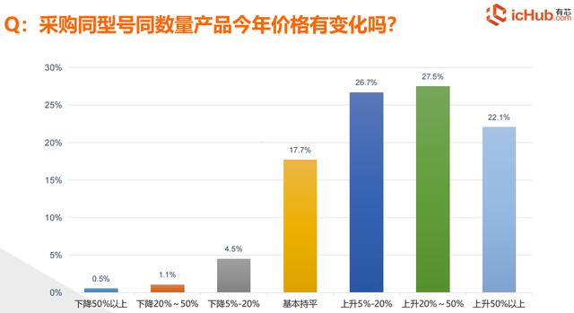 漲價(jià)方面,如上圖所示,今年超過(guò)76.3%調(diào)查樣本表示采購(gòu)?fù)吞?hào)同數(shù)量產(chǎn)品價(jià)格對(duì)比去年價(jià)格上漲,其中,22.1%需求端表示,價(jià)格漲幅超50%。