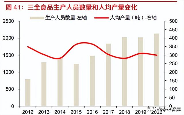 降成本更多通過提升加工端的自動化程度來實(shí)現(xiàn),具體看與大單品規(guī)模和產(chǎn)品結(jié)構(gòu)有關(guān)。我們可 以用人均產(chǎn)量=總產(chǎn)量/生產(chǎn)人員數(shù)量和成本結(jié)構(gòu)來刻畫生產(chǎn)的自動化程度。三全由于有水餃和湯 圓兩大生產(chǎn)自動化程度高的大單品,且體量大,因此人均產(chǎn)量高于千味央廚、立高食品。安井食 品生產(chǎn)人員較多主要由于品類較多、廠區(qū)較多,大單品體量相比水餃湯圓較小,而且米面制品以 面點(diǎn)為主,部分品類所需手工工序多,因此人均產(chǎn)量較低。成本結(jié)構(gòu)角度看,三全、千味和安井 米面制品的“直接人工+制造費(fèi)用”占成本比例分別為 19.5%/22.0%/30.3%,也反映了產(chǎn)品結(jié)構(gòu) 造成的自動化程度差異。