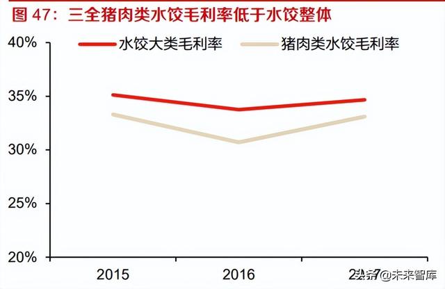 以三全食品的水餃品類為例,大單品豬肉類水餃 2017 年收入達(dá) 13.5 億元,占水餃?zhǔn)杖虢?7 成、 總收入超過 1/4。豬肉水餃作為傳統(tǒng)大單品,帶動了私廚水餃(2012 年推出)、兒童水餃(2015 年推出)等高價(jià)高毛利新品的推廣,水餃品類整體增速、毛利率快于豬肉水餃。