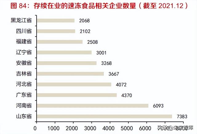 速凍米面的供給特點(diǎn):生產(chǎn)地域限制小+銷售半徑有限。從供給角度,我們也嘗試用兩個(gè)維度刻 畫不同食品品類的屬性:1)全國化生產(chǎn) VS 地域性生產(chǎn):產(chǎn)品生產(chǎn)對特定區(qū)域稟賦(如特定的氣 候地理?xiàng)l件、產(chǎn)業(yè)鏈配套程度等)的依賴強(qiáng)弱,也即產(chǎn)能異地復(fù)制的難度;2)銷售半徑大 VS 銷 售半徑?。寒a(chǎn)品特性、運(yùn)輸成本造成的銷售半徑差異。由于冷鏈物流的成本顯著高于常溫物流, 速凍食品的干線-支線-終端全鏈條的配送、倉儲成本較高,因此銷售半徑有限。速凍生產(chǎn)過程對 自然環(huán)境沒有限制,除魚糜制品所用的魚漿生產(chǎn)主要集中在東南沿海和湖北,其他米面糧油、肉 類等原材料地域性較弱,雖然在河南等農(nóng)業(yè)大省產(chǎn)業(yè)配套更好,但整體上異地復(fù)制的限制較少, 龍頭依靠充足資金能夠順利實(shí)現(xiàn)全國化產(chǎn)能投放。