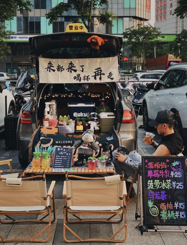 這些攤位其實都是打開的汽車后備箱,上面掛一張文藝風的軟布做招牌,纏繞一串暖黃色小燈泡,加上小音箱,手寫小白板,夏夜浪漫的氛圍瞬間拉滿。