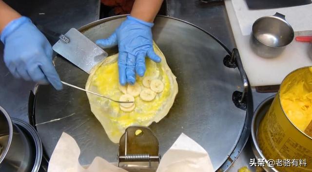 接著是香蕉燒餅,面皮經(jīng)過這樣反復(fù)摔打,更具韌性,而且薄如蟬翼,放在炙熱的鐵餅上烤制,打入一個(gè)雞蛋,再把新鮮的香蕉肉放進(jìn)去,烤至微軟就可以卷起來出鍋了,再來點(diǎn)奶油,酸梅汁,棉花糖,一份只要14塊錢,看著就流口水。
