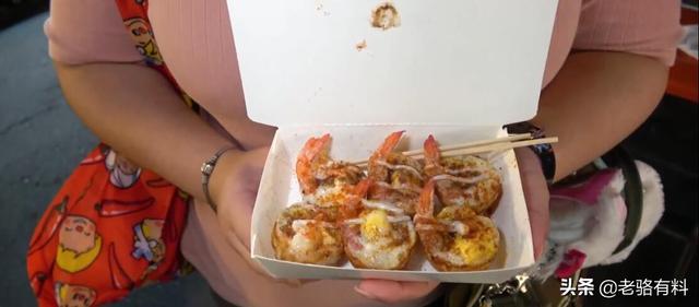 接著是鵪鶉蛋龍蝦球。每一個(gè)蝦球里都有一整顆鵪鶉蛋和新鮮去皮龍蝦尾,在模具里烤至金黃,撒上孜然和酸辣醬,一盒只要13塊錢。這個(gè)一定很有營養(yǎng)。
