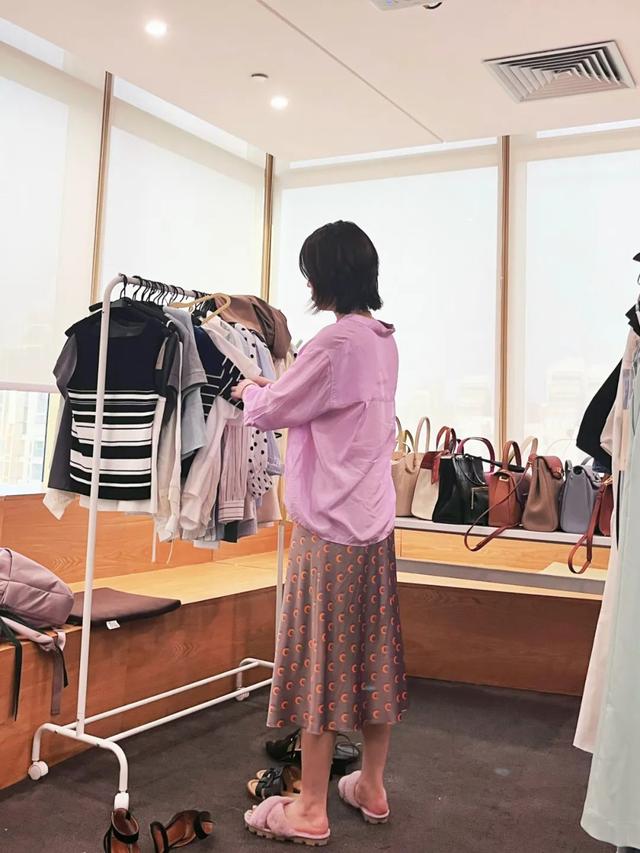 Cecile:“今天想穿得輕松一些,衣服都選了既寬松又柔軟的款式。整體不想這么單調(diào),裙子配了帶花紋的,毛毛拖鞋點睛,穿著也很舒服?!报?/p>