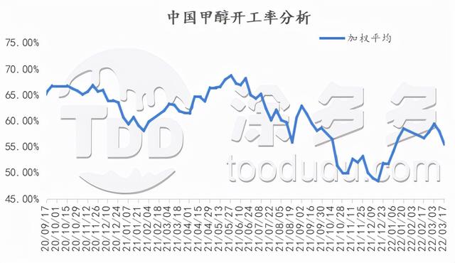 目前全國甲醇產(chǎn)能約10092.5萬噸,本周取樣統(tǒng)計(jì)129家企業(yè)產(chǎn)能7683.5萬噸,總開工率為(按照各片區(qū)權(quán)重加權(quán)所得)55.45%,較上周減少2.53%。本周西南區(qū)市場開工變動(dòng)不大,開工穩(wěn)定在71.69%,重慶卡貝樂85萬噸裝置于2月10日供氣緊張降負(fù)運(yùn)行,重啟時(shí)間待定;瀘天化45萬噸裝置運(yùn)行平穩(wěn);玖源化工50萬噸裝置月2月10日降負(fù)運(yùn)行,恢復(fù)時(shí)間待定;川維10萬噸天然氣裝置于2022年2月10日限氣降負(fù)運(yùn)行,恢復(fù)時(shí)間待定。西北地區(qū)市開工有所減少,本周開工較上周減少2.03%至73.54%,內(nèi)蒙古博源100萬噸天然氣裝置于11月19日限氣停車,一套60萬噸于2月28日點(diǎn)火,一套40萬裝置3月6日;榆林兗礦二期80萬噸裝置于9月18日停車,目前裝置維持8成運(yùn)行;陜西長青60萬噸裝置于3月13日降負(fù)運(yùn)行,恢復(fù)時(shí)間待定。山東地區(qū)開工窄幅下調(diào),目前開工在47.89%,山東榮信25萬噸裝置限產(chǎn)降負(fù)。華北市場開工率在54.15%,較上周減少9.84%,悅安達(dá)一期20萬噸裝置于2月7日降負(fù)運(yùn)行,恢復(fù)時(shí)間待定,同煤60萬噸裝置于3月14日停車檢修,計(jì)劃4月14日重啟。華東地區(qū)市場開工率在49.31%。華中地區(qū)目前整體開工率在36.59%,鶴壁60萬噸/年甲醇裝置因故障于2月25日停車檢修,重啟時(shí)間未定;中原大化50萬噸裝置于2022年3月13日故障停車,預(yù)計(jì)3月28日重啟。東北開工率在25.84%,七臺(tái)河億達(dá)信10萬噸/年煤制裝置停車檢修,預(yù)計(jì)檢修20天左右。華南地區(qū)市場開工率穩(wěn)定在84.56%。