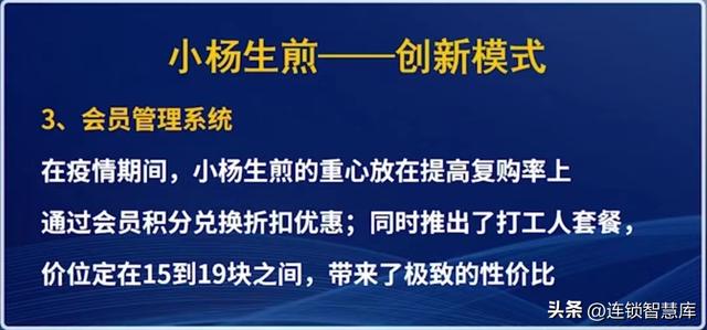 創(chuàng)新三:數(shù)據(jù)管理創(chuàng)新,小楊生煎自己建立了會員管理系統(tǒng),很大程度的扛住了這兩年的疫情下帶來的壓力,在疫情期間,提高會員的復(fù)購率,通過積分兌換進(jìn)行折扣優(yōu)惠,還推出了打工人套餐,極具性價比。