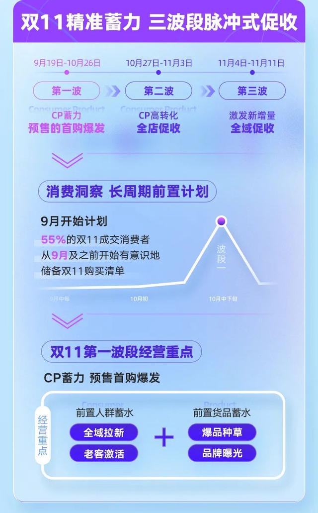 從品牌商家、電商平臺到經(jīng)營工具,都開始更看重人和貨運營的長效價值。今年雙11,阿里媽媽將最后雙11長周期的運營節(jié)奏,切分出三個階段:1、9月19日-10月26日,也就是現(xiàn)階段,聚焦人貨蓄水,通過全域種草、擴充流量池子,讓貨品觸達更多潛在客群;2、10月27日-11月3日,加速人群流轉(zhuǎn),調(diào)整貨品結(jié)構(gòu),通過多次觸達、權(quán)益預(yù)告和拉新入會等方式喚醒蓄水人群;3、11月4日-11月11日,跨品類滲透、帶動動銷找到更多機會點。
