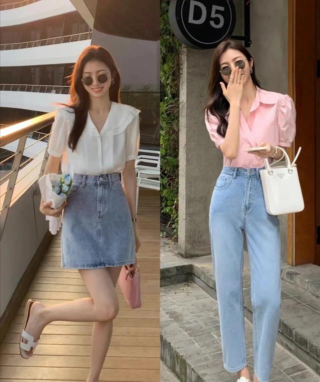 一件白色襯衫,具備著無數(shù)種穿搭方式,如果利用可以秀出小腿線條的牛仔短裙相配,這組穿搭就會特別的小清新。