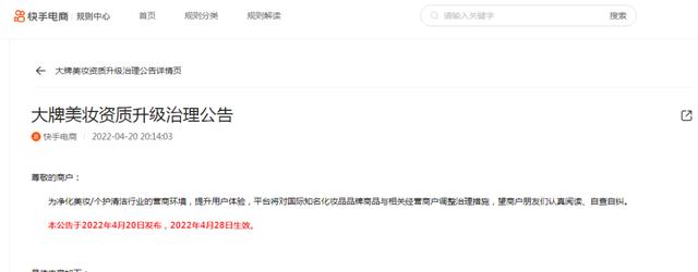 關(guān)于本次調(diào)整,行業(yè)內(nèi)普遍認(rèn)為是對4月底“快手大牌美妝資質(zhì)治理”動(dòng)作的延續(xù)。