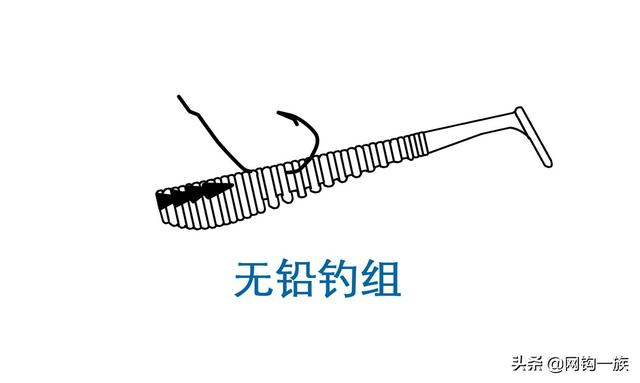 無鉛釣組,這里的無鉛不是指沒有鉛墜配重,你看圖里軟餌頭不還塞了一個鉛釘配重么。這里說的無鉛就是沒有單獨的鉛墜,只是增加軟餌自身重量。適合比較安靜的水域,模仿受傷小魚下落和浮水狀態(tài)。這個在淡水池塘用得比較多,國內(nèi)也就釣淡水黑魚雷強能用上,本人很少用。