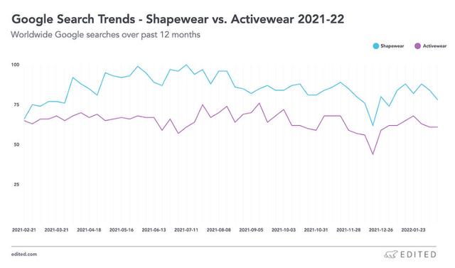 2020年,全球運(yùn)動(dòng)服市場規(guī)模約為3,535億美元,顯然使塑身衣相形見絀。盡管如此,在過去的一年中,全球范圍內(nèi)對解決方案服裝的搜索量有所增加,這意味著客戶正試圖更多地了解該品類更多的細(xì)節(jié),并打算購買。