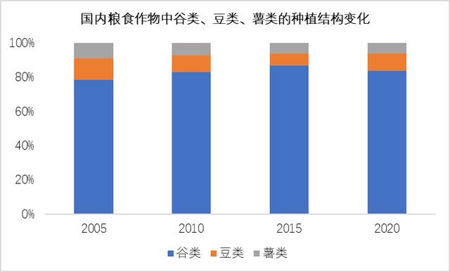 國內(nèi)的糧食作物往往分為谷物、豆類、薯類3大類。在有數(shù)據(jù)記錄的幾十年時(shí)間里,谷類的種植結(jié)構(gòu)占比是最大的,在整個(gè)糧食作物種植結(jié)構(gòu)中基本達(dá)到80%。
