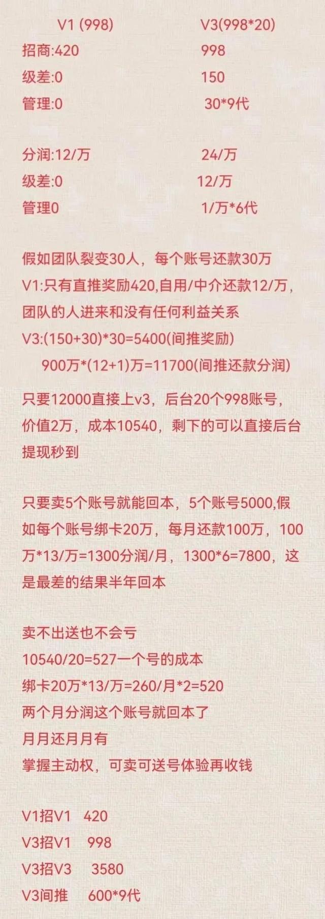 加盟智能還款A(yù)PP過后,“5%額度還清當(dāng)月100%賬單”的意思“不是不用還銀行的錢,是你多久有錢多久還”,而是錢還是得全部還,只不過是拖一拖再還,而還款行為產(chǎn)生的手續(xù)費(fèi)和分潤,已經(jīng)交到平臺(tái)和代理手中了。哪怕拉人加盟這種輔助方式的存在,有一定的分潤可以加速回本賺錢,但這個(gè)人得代理商自己花時(shí)費(fèi)力去找,充滿了不確定。