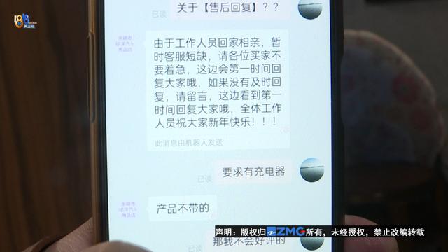 之后楊先生也把問題反映給了店家客服,說沒有原裝線沒法充電,對(duì)方說你不是退貨了嗎?可楊先生不想退貨,只是想要充電線。平臺(tái)客服介入后,說可以為楊先生申請(qǐng)10元退款,同時(shí)無需退貨。但楊先生認(rèn)為,這根本沒有解決自己的問題。他現(xiàn)場詢問店家客服,電話號(hào)碼是多少。對(duì)方說沒有電話。楊先生說找了1818黃金眼,對(duì)方回復(fù)“好的呢,親”。