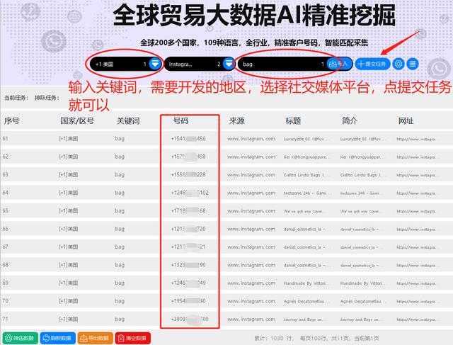 只要輸入您的產品詞,定位市場,就可以從六大社交媒體:Facebook、Twitter、Instagram、LinkedIn、Pinterest、YouTube、Tik Tok,按精準國家搜索買家手機號,為您帶來大量的精準客戶資源。