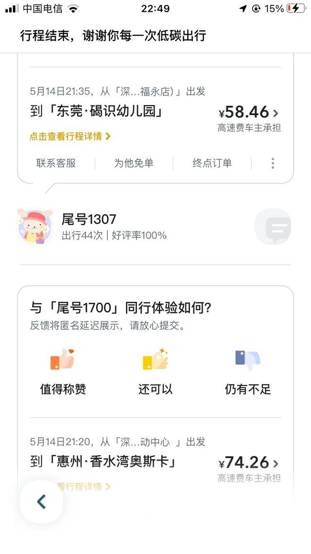不過下午晚高峰免傭期接了個深圳單,40公里142的單價,價錢還不錯。然后我還信那些車友說可以在深圳等單,等那些回東莞的單,結(jié)果我一等就是三個小時,都沒有等到一單,然后我接了嘀嗒的兩個順風(fēng)車訂單回東莞了。傻愣愣的在深圳等了三個小時,這根本沒有回程單,好苦啊。順風(fēng)車訂單全程80公里 130。也跑的好累,跑了一個半小時。