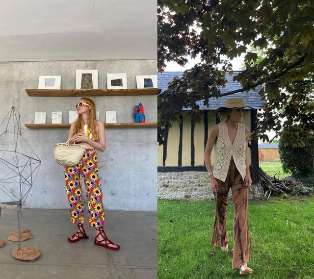 如果用一個詞來概括她的穿衣風格,那一定是波西米亞混搭風。下面的這兩身就是典型的波西米亞風,左邊的印花褲子搭配鏤空的短上衣,而右邊只系一個扣子的鏤空上衣又選了顏色比較深的花紋長褲,兩身都能給100分。
