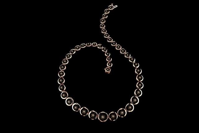據(jù)稱是 GIA 鑒定過的最大一顆的無燒星光藍寶石。鏈環(huán)用了70顆總重104.42ct的黑色星光藍寶石,由玫瑰金鑲嵌而成,與主石相輝映。