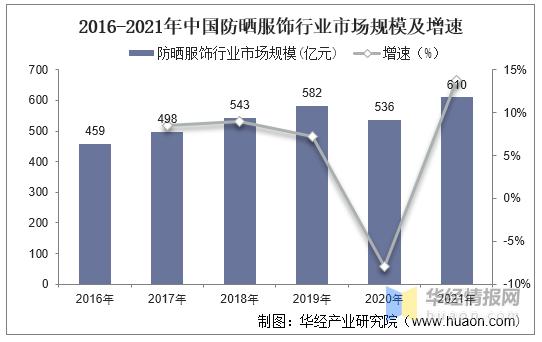 國內(nèi)防曬服飾市場(chǎng)主要包括具有防曬功能的衣服、傘具、帽子、墨鏡、口罩、披肩、袖套及手套等產(chǎn)品。2016至2019年,我國防曬服飾市場(chǎng)規(guī)模從459億元穩(wěn)步增長(zhǎng)至582億元,2020年受到疫情影響下滑至536億元,同比減少7.9%,2021年回升至610億元,同比增長(zhǎng)13.8%。