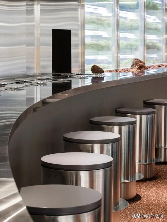 店鋪的空間設(shè)計(jì)與太空培育的主題相呼應(yīng),并用玻璃對栽培傳送區(qū)進(jìn)行分隔,為顧客展示無需借助土壤與陽光便能自由生長的栽培技術(shù)。與此同時(shí),設(shè)計(jì)師還在全機(jī)械化的空間中加入了紅沙和巖石作為點(diǎn)綴,提醒人們感恩自然的饋贈。