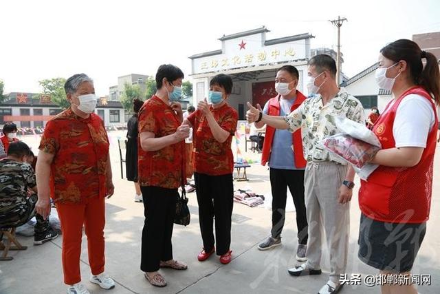 當(dāng)日早晨8點(diǎn),王郎社區(qū)文化中心廣場(chǎng)上人潮涌動(dòng),老人們?nèi)膛宕骺谡?,保持安全距離,在專門設(shè)置的安全路線有序排隊(duì)領(lǐng)取定制的夏裝;工作人員和志愿者快速地為老人們登記、拿取專屬的服裝,遞到老人們的手上。老人們手捧著新衣,眼角的魚尾紋寫滿了幸福,你一言我一語(yǔ),洋溢著特別的喜悅。